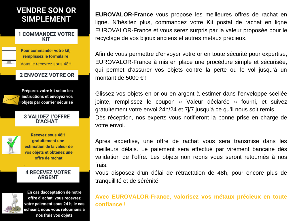 Pour cela, commandez en ligne votre Kit de rachat EUROVALOR-France, envoyez-nous vos objets. Comme de nombreux clients, vous serez à votre tour très agréablement surpris par la valeur de l’offre de rachat d’or que nous serons en mesure de vous proposer.